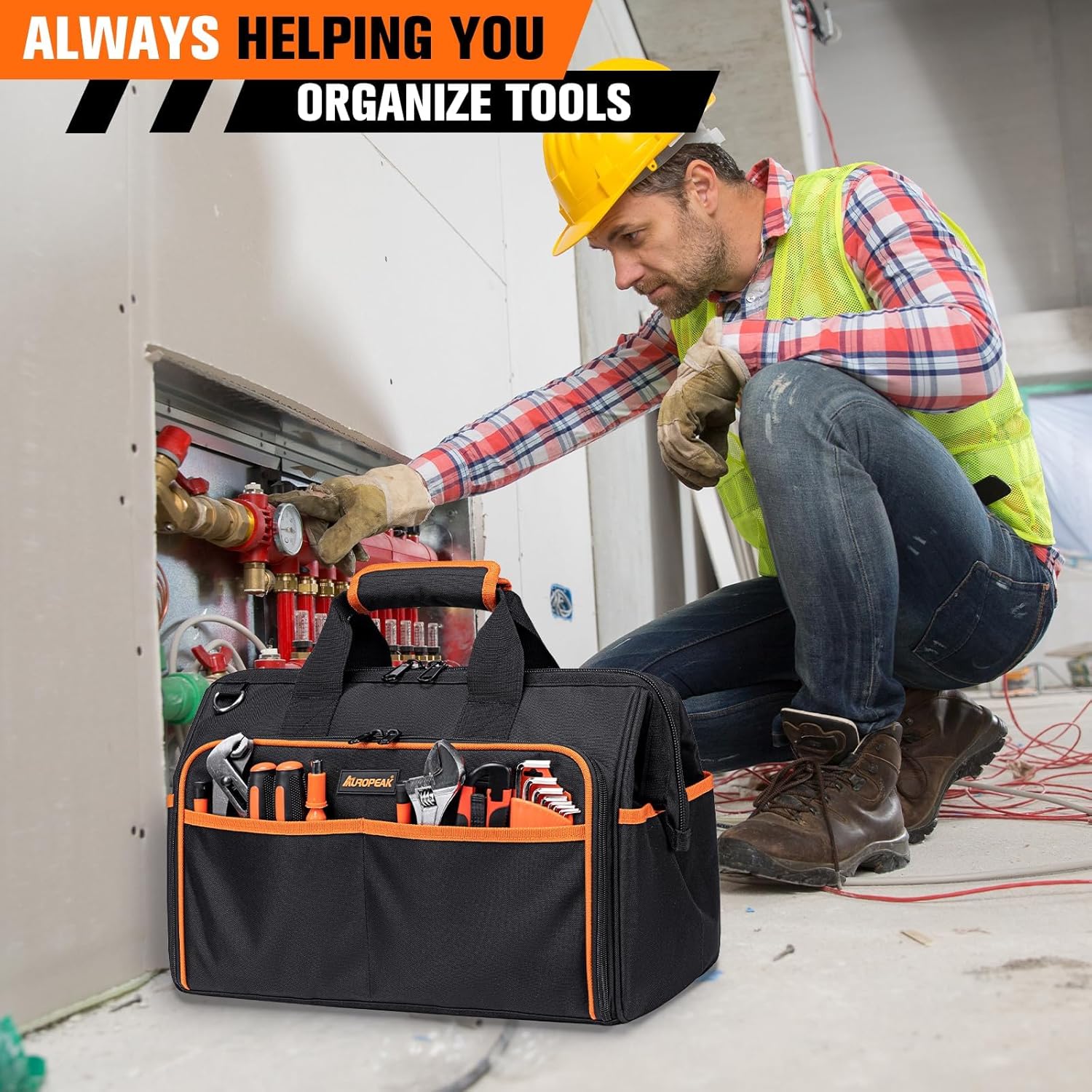 Heavy Duty Tool Bag 17.3-Inch, 26-Pocket Large Tool Bags for Men Women with Adjustable Shoulder Strap,Waterproof, Foldable Tool Bag Organizer for HVAC Electricians Mechanics Craftsman Contracto