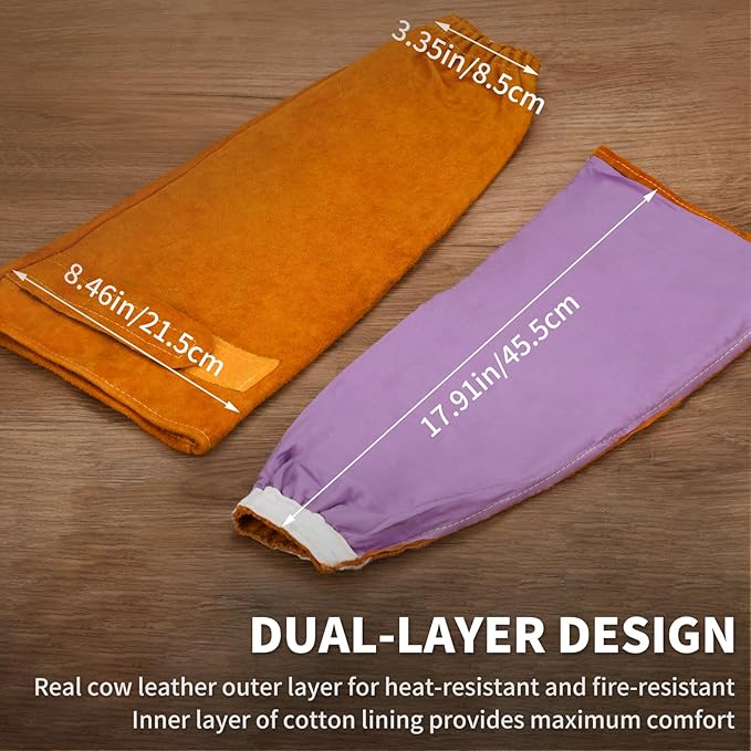 • ▶【Dual-Layer Design】Leather welding arm guards feature a thick, high-quality cowhide outer layer for heat and spark resistance. Inside, there is a cotton lining designed to insulate heat, providing maximum comfort
