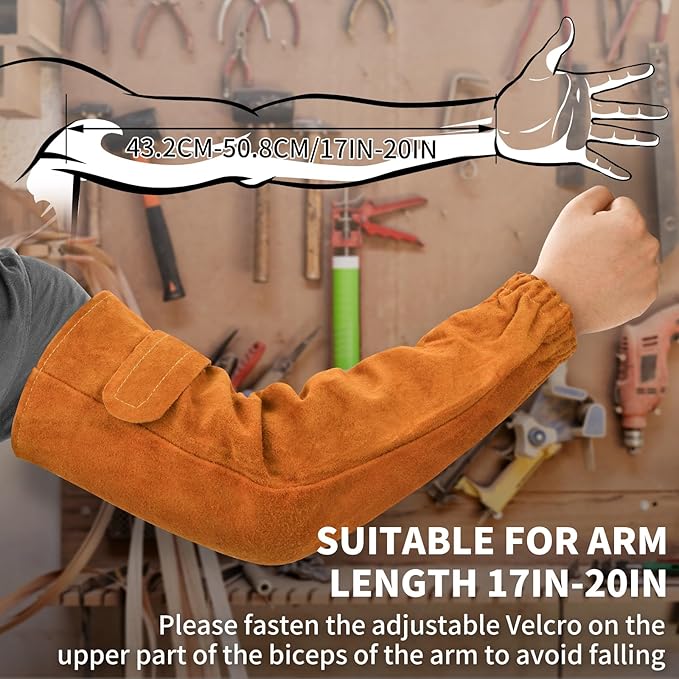 • ▶【Firm & Not Fall Off】Welding arm sleeves feature a shrink elastic cuff design at the wrist and a velcro strap on the arm to adjust for firmly attached to the upper part of your bicep, ensuring the leather welding sleeve stays securely in place during work