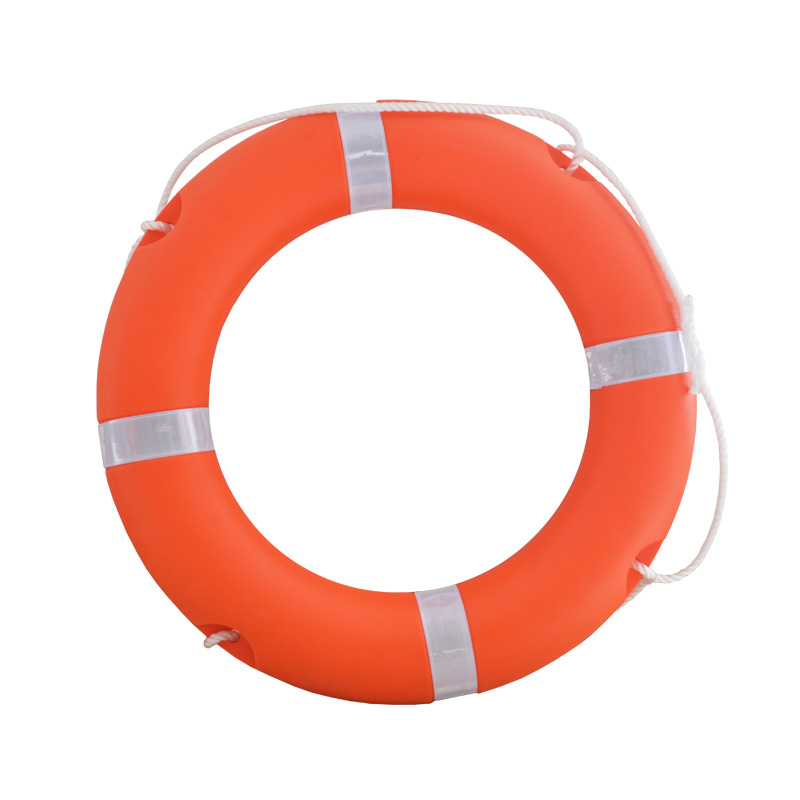 O-ring lifebuoy manufactured in high density polythene filled with polyurethene closed cell foam, reflecting tape and rope.